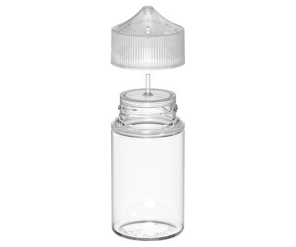 Transparente 75 ml Flasche mit einem All-In-One Deckel mit einer schmalen Tropfspitze und Kindersicherung. Der Deckel verhindert zuverlässig das Auslaufen bei geschlossenem Verschluss. Ein optimierter Druckausgleich sorgt für saubere Dosierung - ohne nachlaufen.